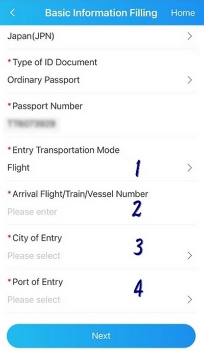 1、中国まで利用する交通方法を選択下さい。