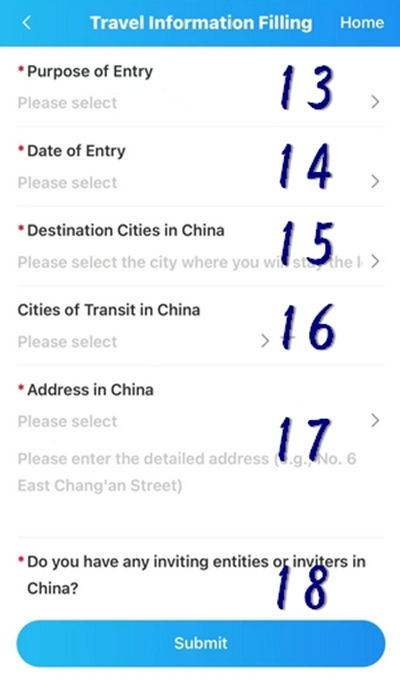 18 中国での受け入れ機関などがあるかを聞かれております。【是】にレ点チェックを入れて下さい。